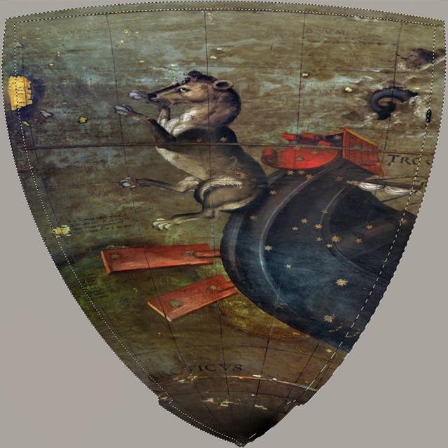 Die Textur für jedes der 16 Einzelteile der Globuskugel wurde jeweils einzeln projiziert und von der Forschungsgruppe der Fachrichtung Knowledge Visualization der ZHdK per Bildbearbeitung über den Rand hinaus (linkes Bild) ergänzt, um nach dem Druck einen sauberen Übergang zu gewährleisten.